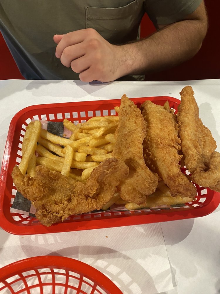 2 pieces catfish, 2 pieces tilapia and 6 pieces shrimp.